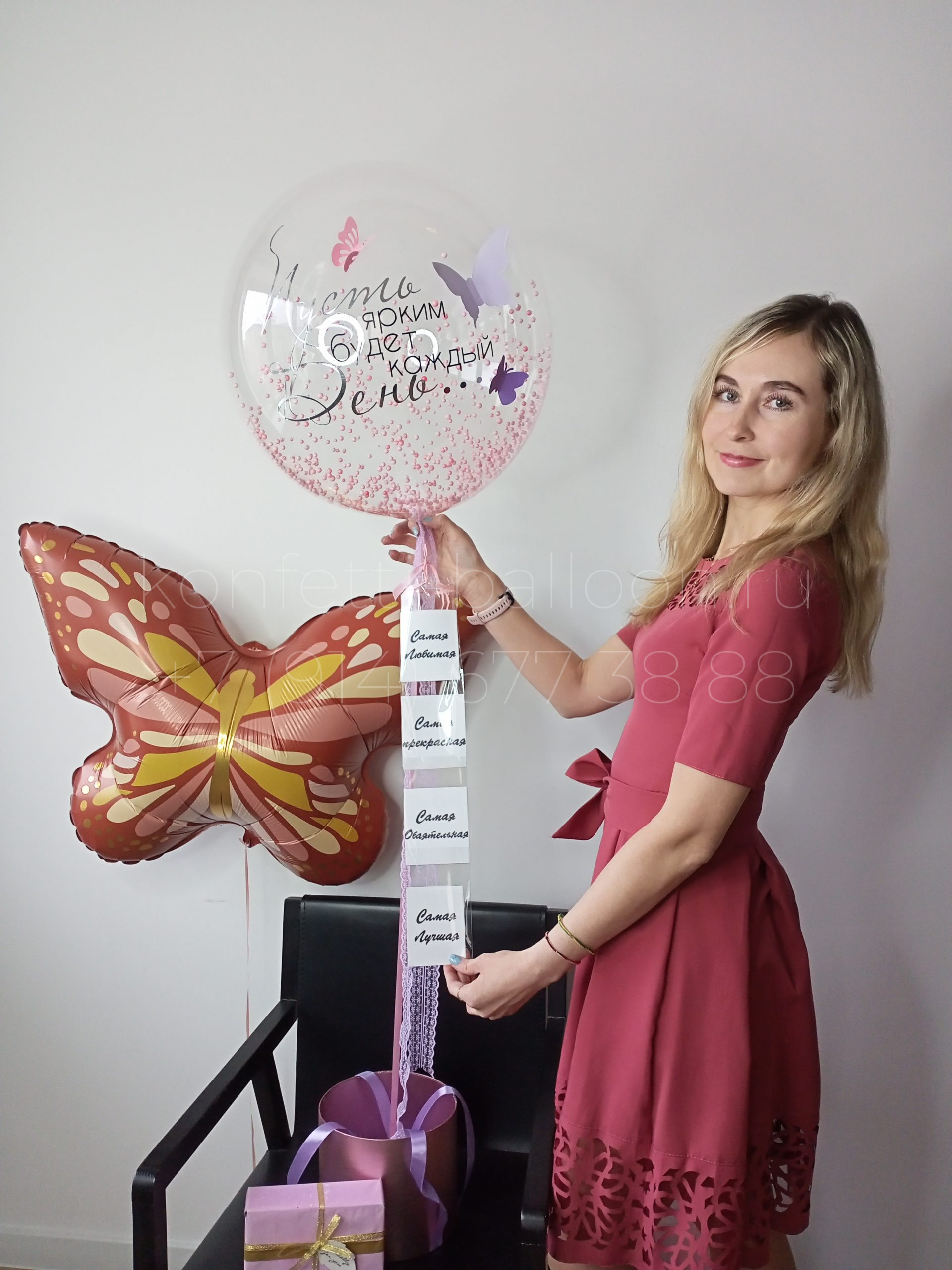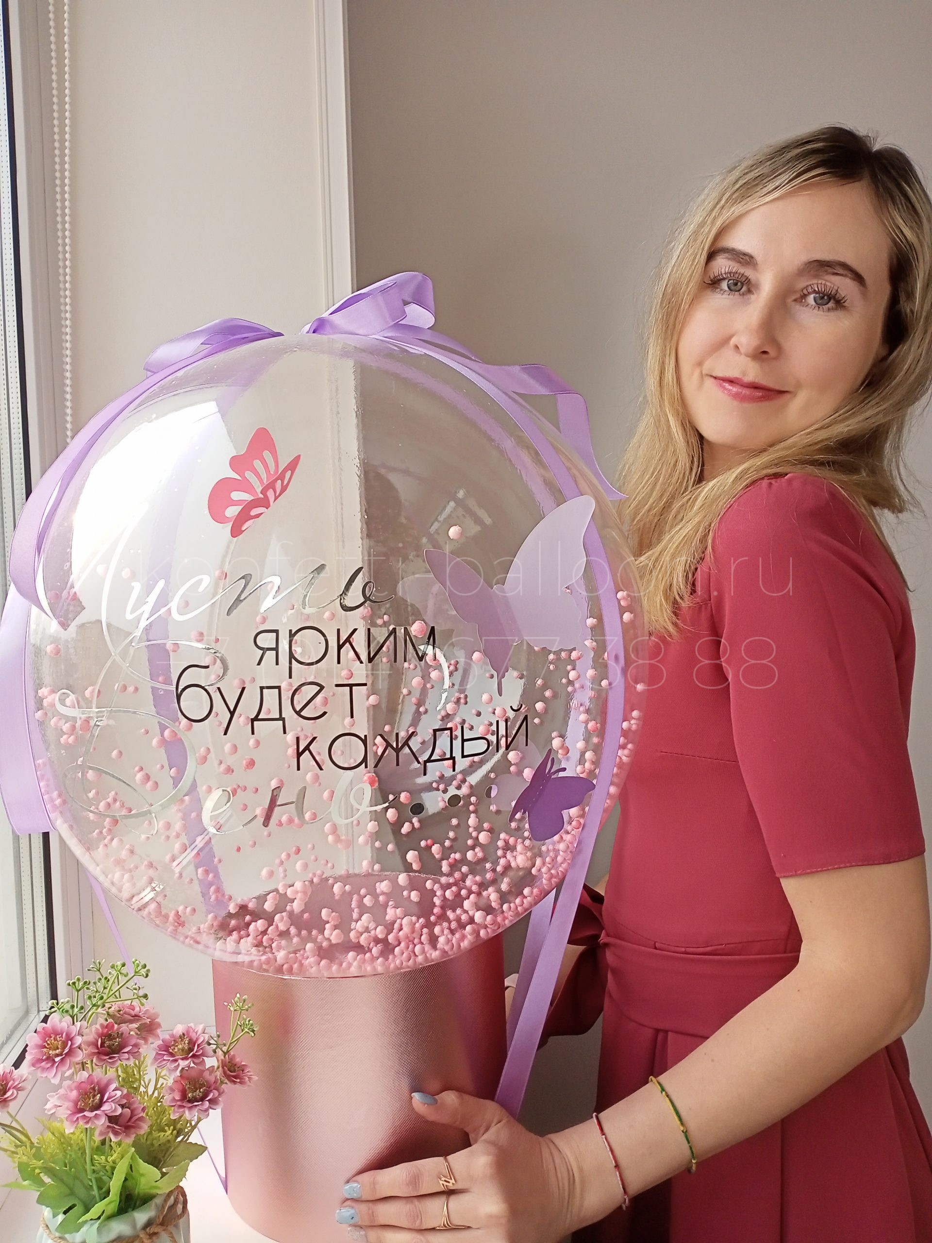 Баблобокс с шаром Bubbles (50-55 см) с пенопластом внутри и индивидуальной надписью. Возможен декор бумажные бабочки (+200 рублей) и записки вместо купюр
