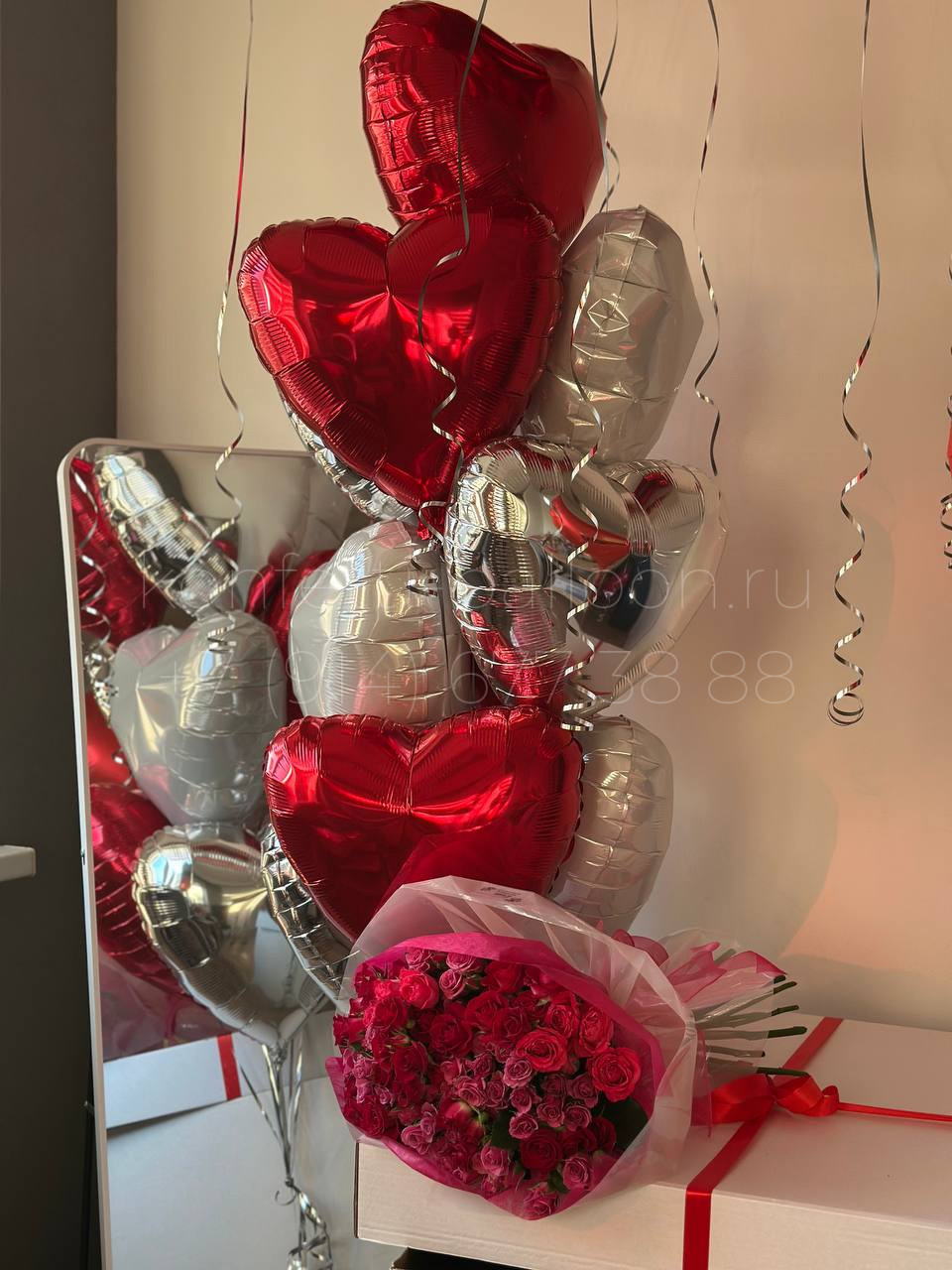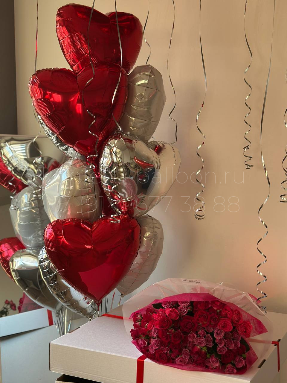 Композиция цветы и шары сердца ко Дню Влюбленных