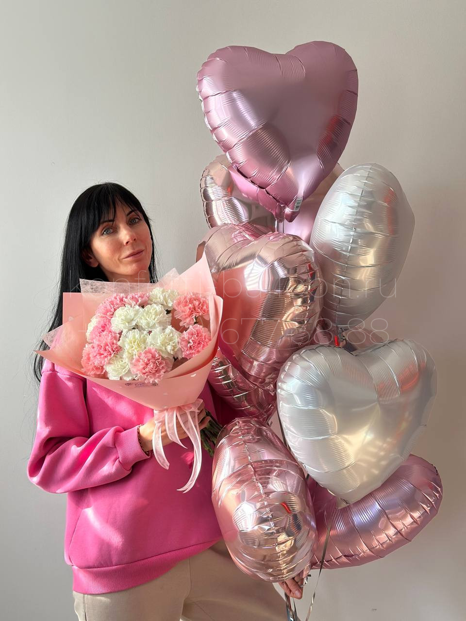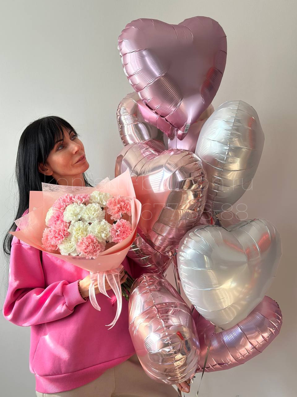 Композиция цветы и шары сердца ко Дню Влюбленных