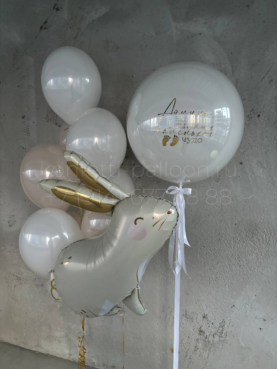 Композиция из гелиевых шаров с зайкой для девочки, на выписку из роддома