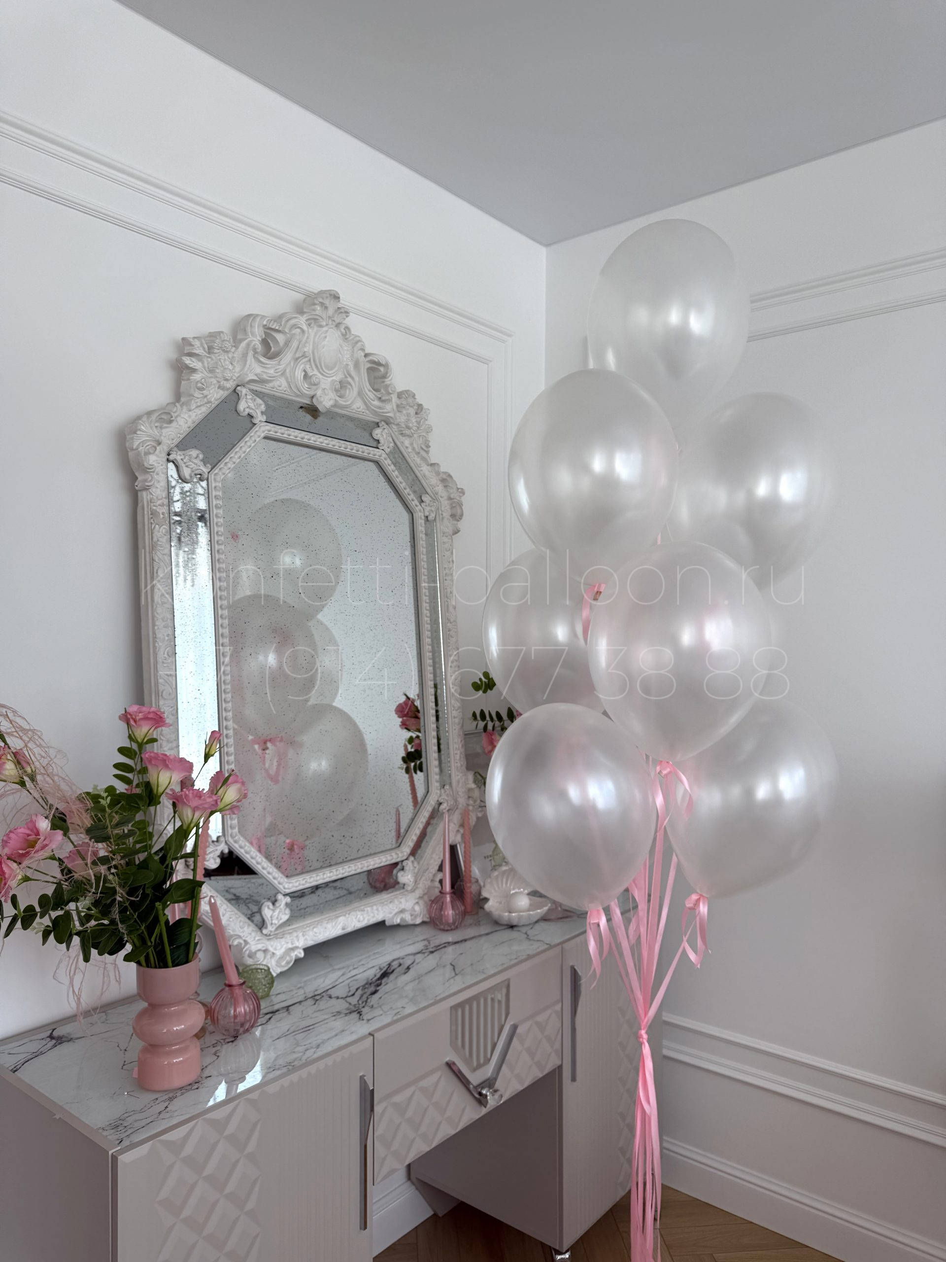 Связка из гелиевых шаров на атласных лентах с бантиком из атласной ленты у основания шара: