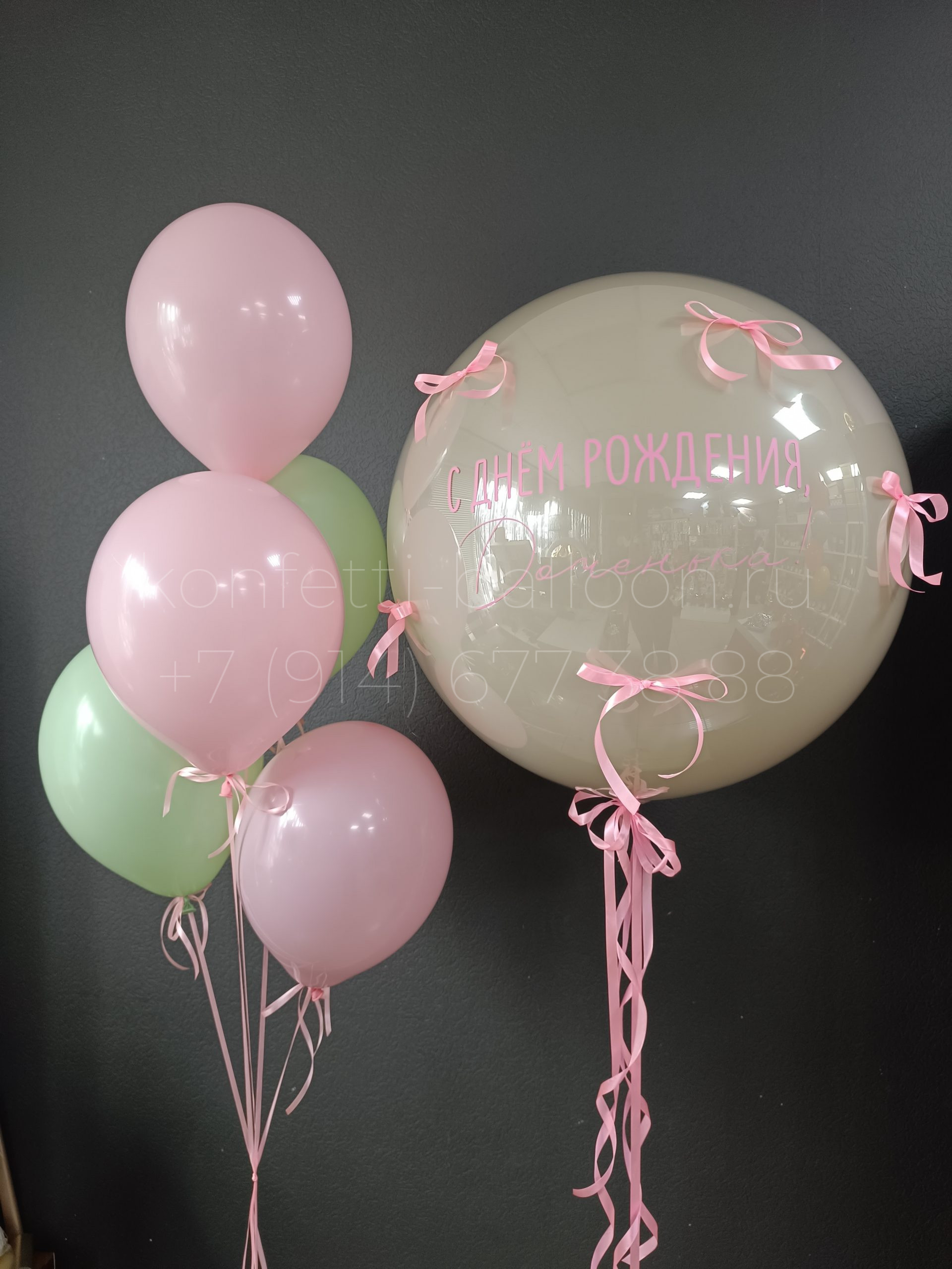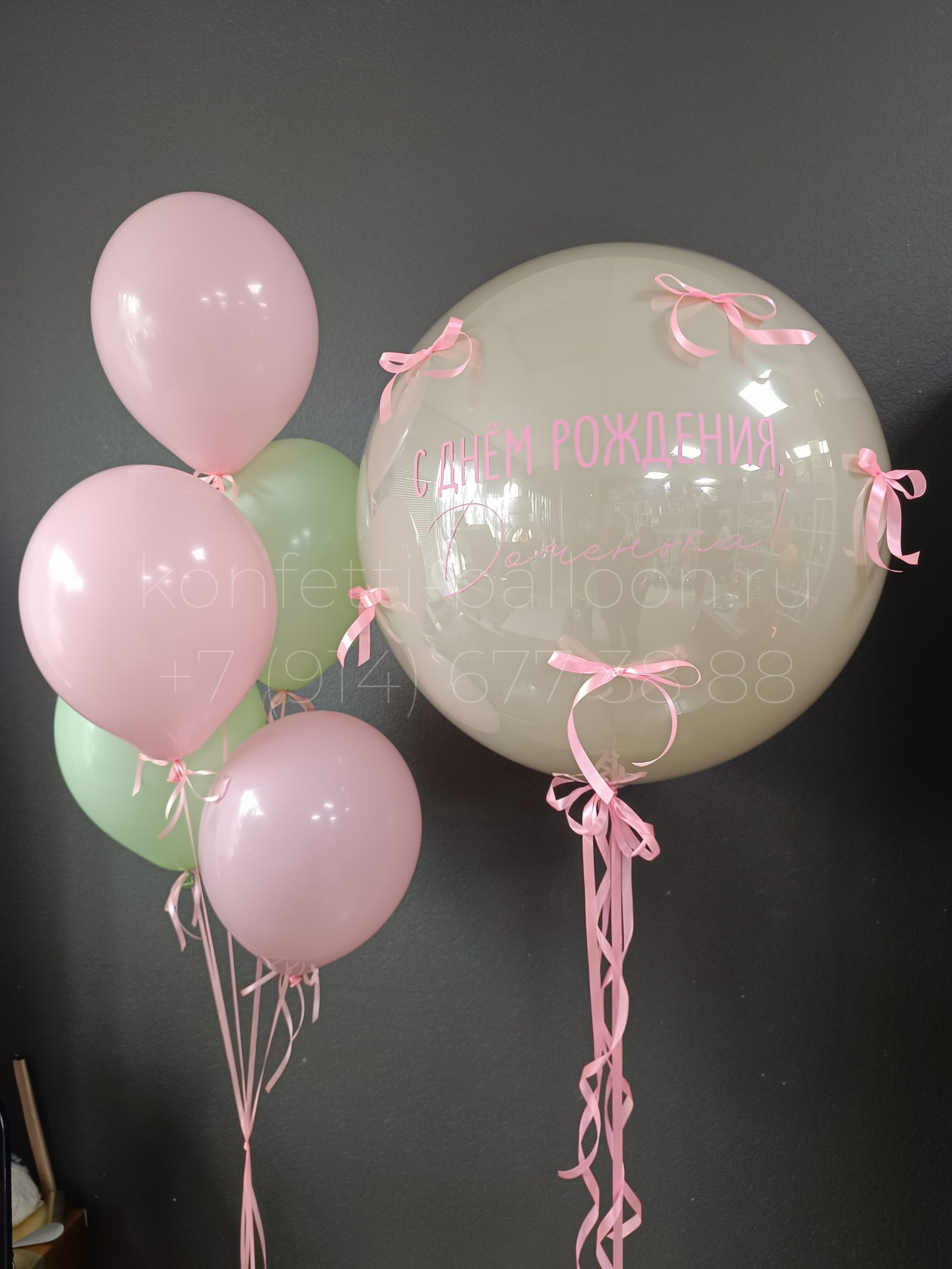 Шар гигант 60-65 см в стеклянной технике и индивидуальной надписью, с дополнительным декором бантики из атласной ленты