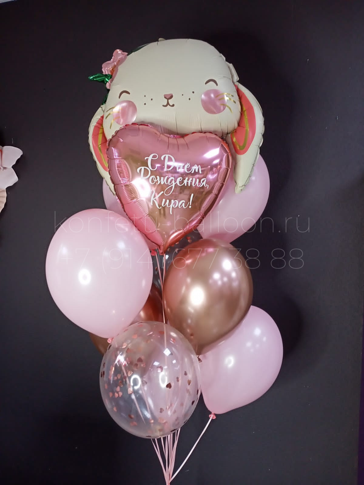 Связка: фольгированная фигура зайка, фольгированное сердце 18 дюймов (45 см) с индивидуальной надписью, 2 латексных шара Хром 12 дюймов (30 см), 2 латексных шара с конфетти 12 дюймов (30 см), 4 однотонных латексных шара 12 дюймов (30 см)