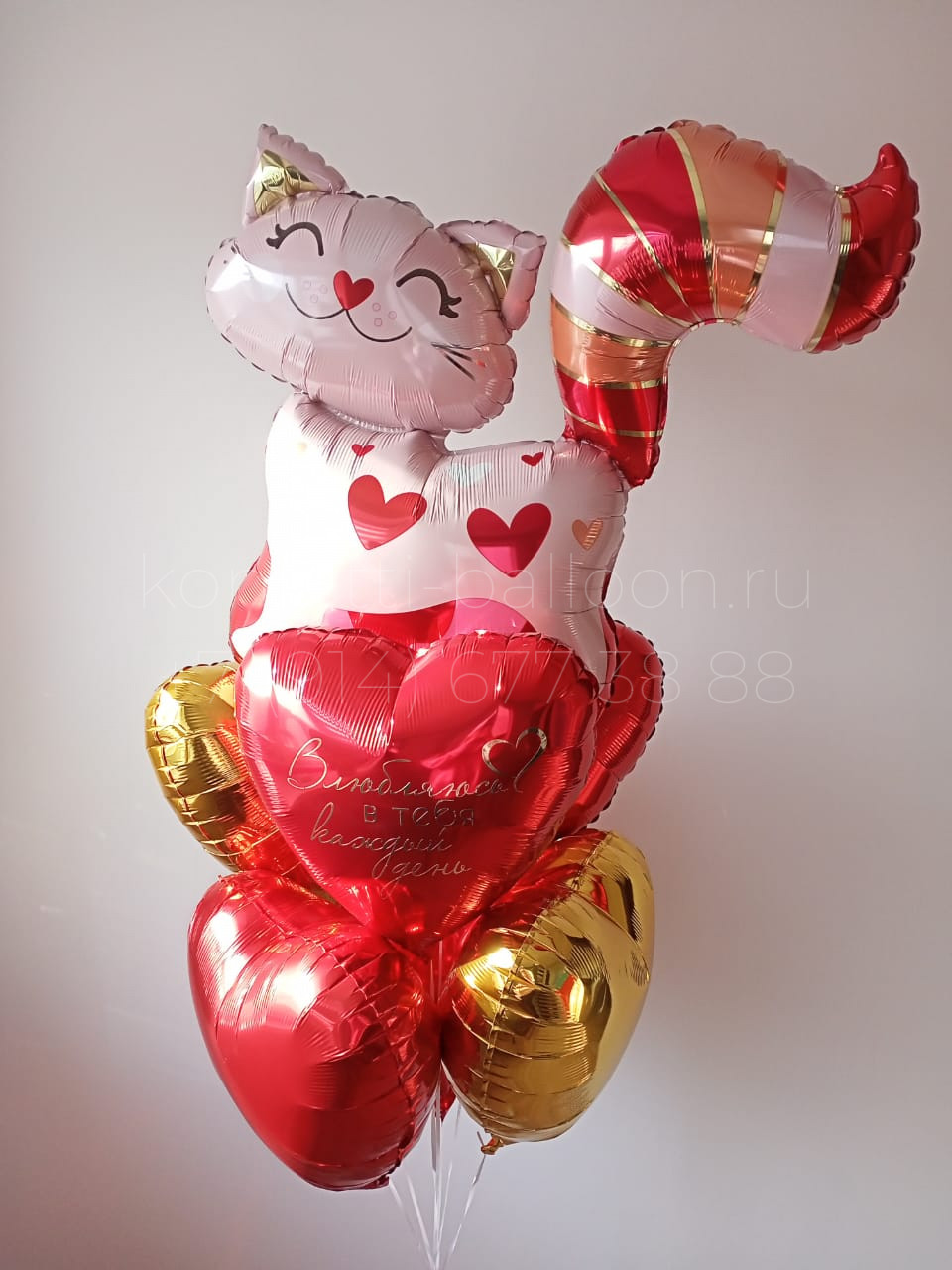 Композиция из гелиевых шаров: 2 красных и 3 золотых фольгированных сердца (размер 18 дюймов, 45 см), 1 красное фольгированное сердце (18 дюймов, 45 см) с индивидуальной надписью, 1 фольгированная фигура Кошка