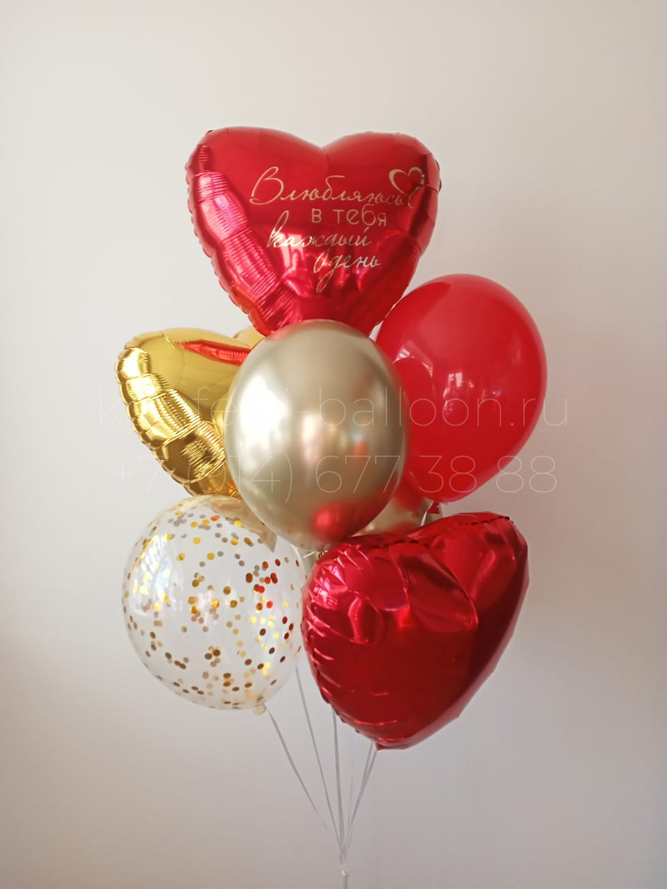 Композиция из гелиевых шаров: 1 красное и 1 золотое фольгированные сердца (размер 18 дюймов, 45 см), 1 красное фольгированное сердце (18 дюймов, 45 см) с индивидуальной надписью, 2 латексных шара Хром, 1 латексный шар с конфетти, 1 латексный однотонный шар