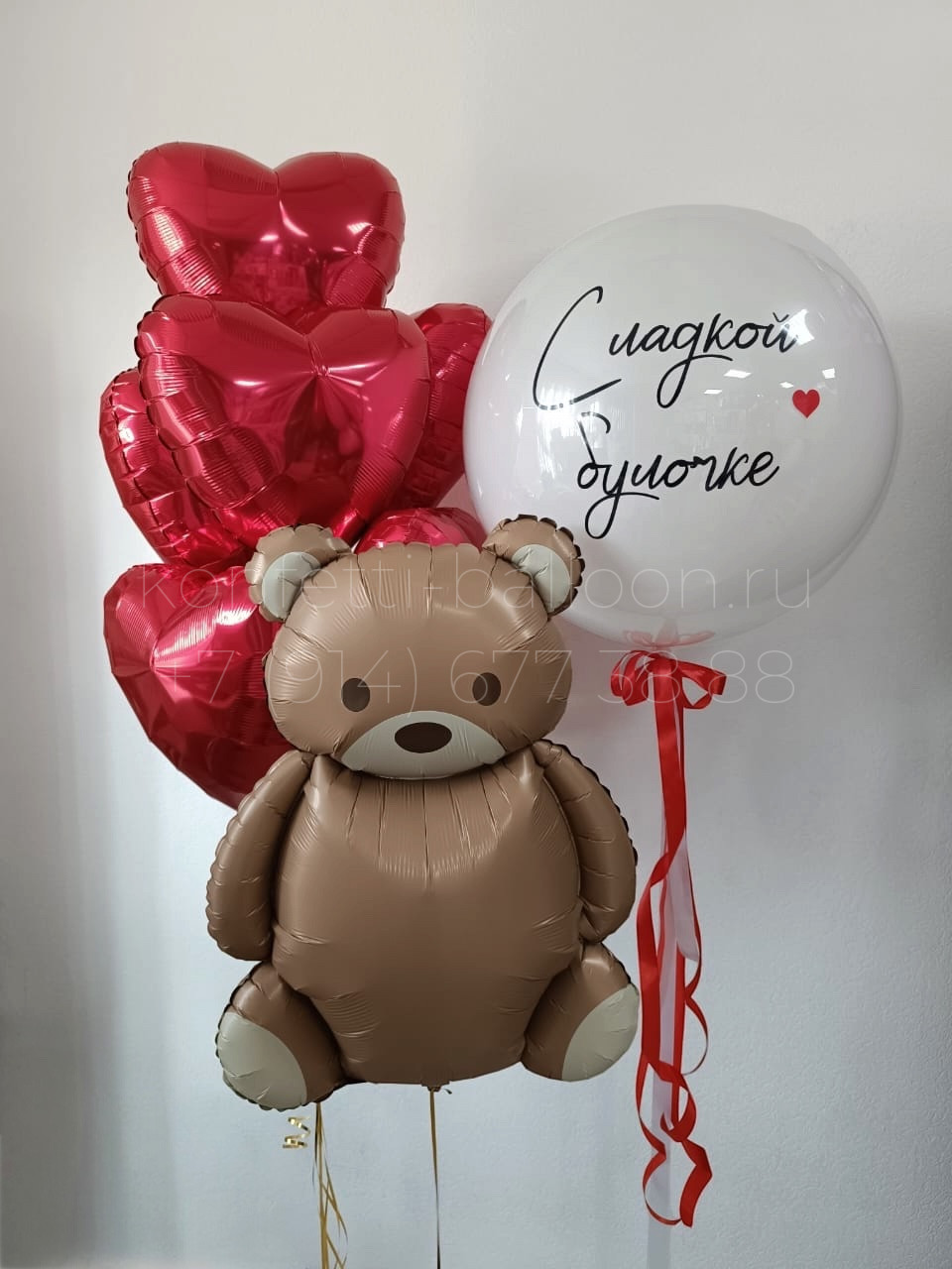 Композиция из гелиевых шаров с мишкой и сердцами