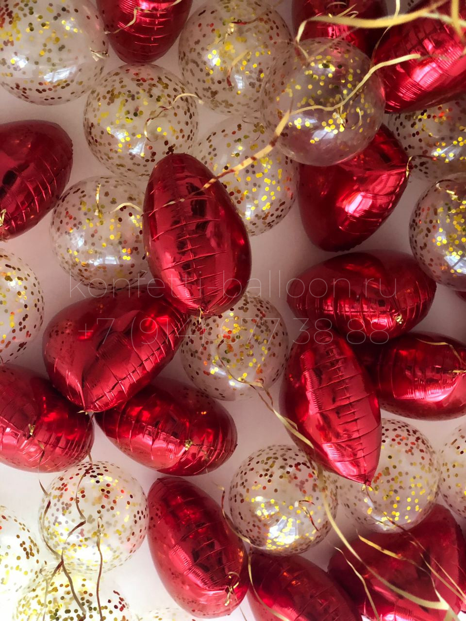 Россыпь шаров под потолок: 11 фольгированных сердец (размер 18 дюймов, 45 см), 15 латексных шаров с конфетти (размер 12 дюймов, 30 см)