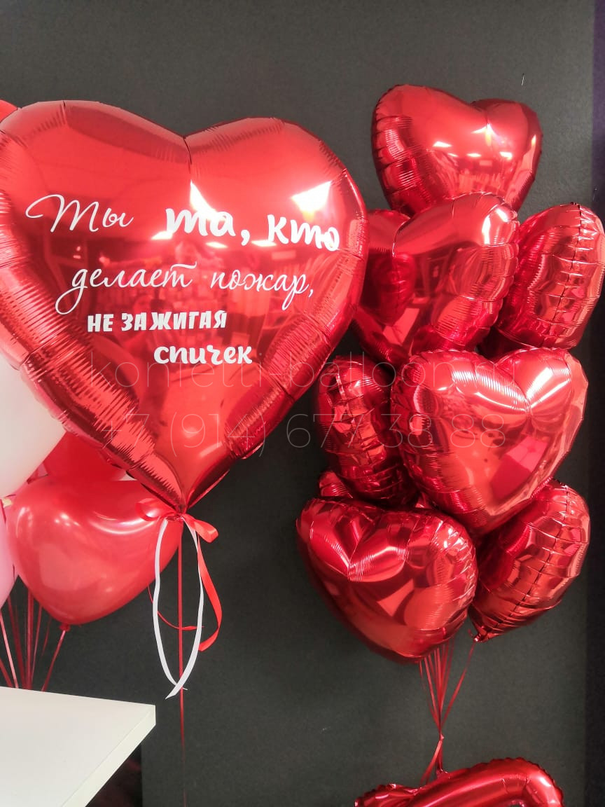 В составе фольгированное сердце-гигант (размер 70 см) с индивидуальной надписью, 10 фольгированных сердец (размер 18 дюймов, 45 см)