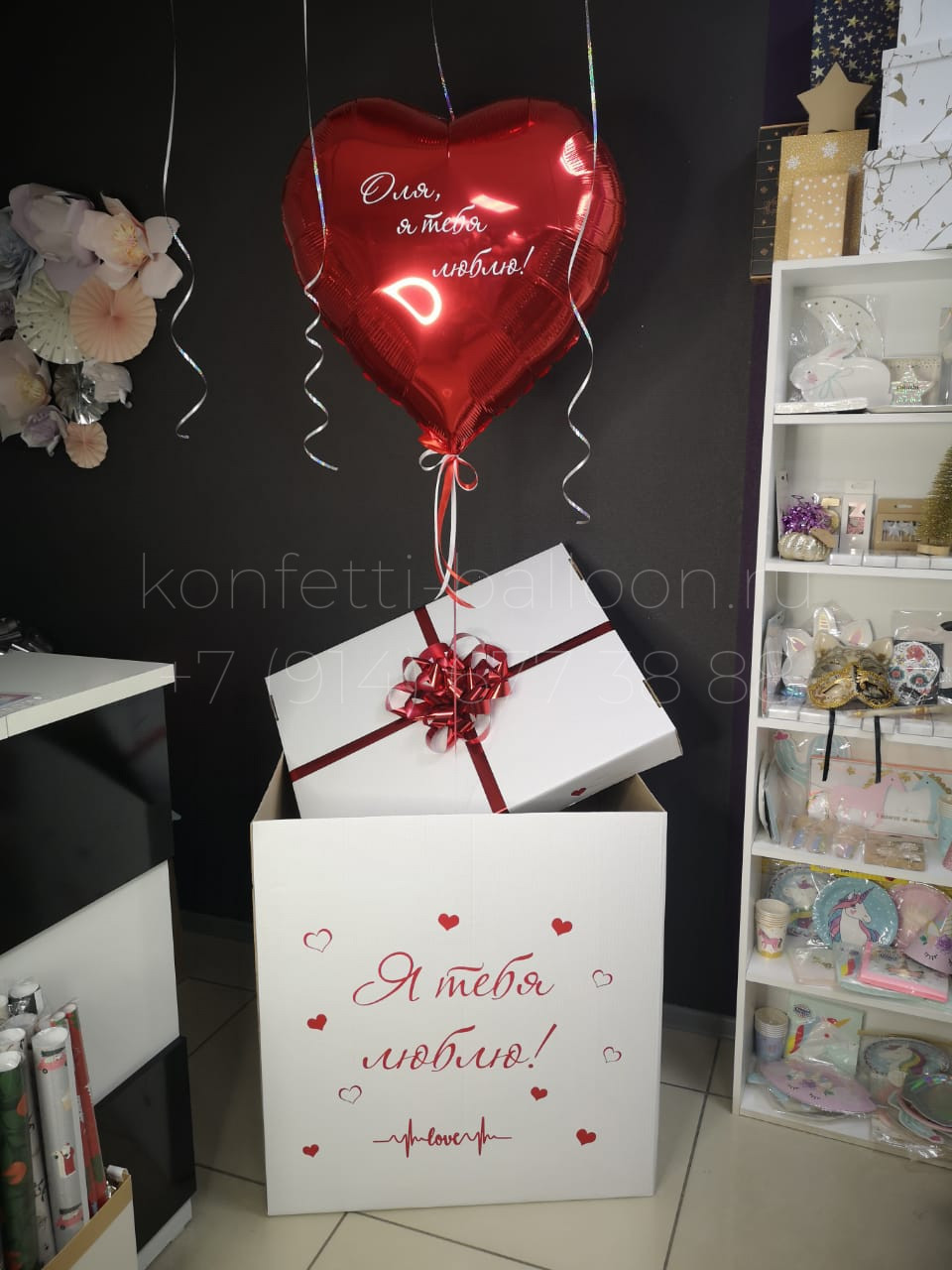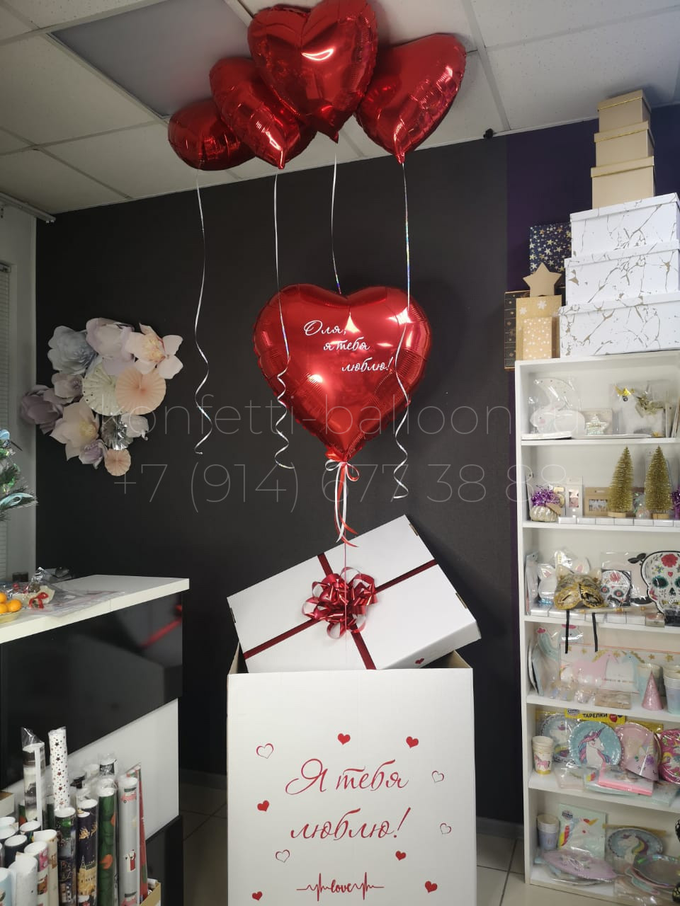 1 сердце-гигант (70 см) с индивидуальной надписью, 4 фольгированных сердца 18 дюймов (45 см), вылетающие к потолку