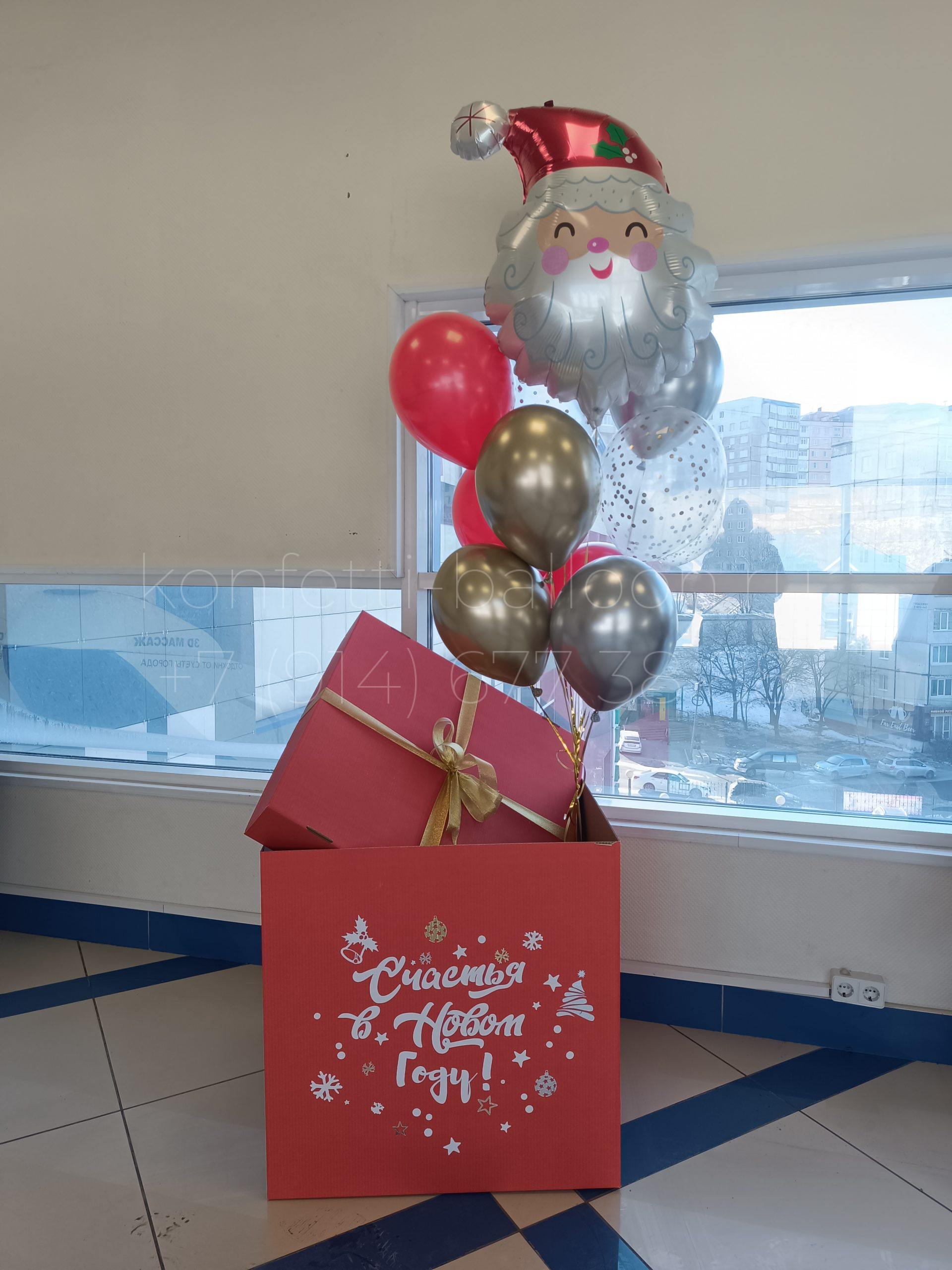 Коробка сюрприз с гелиевыми шарами на Новый год с Дед Морозом