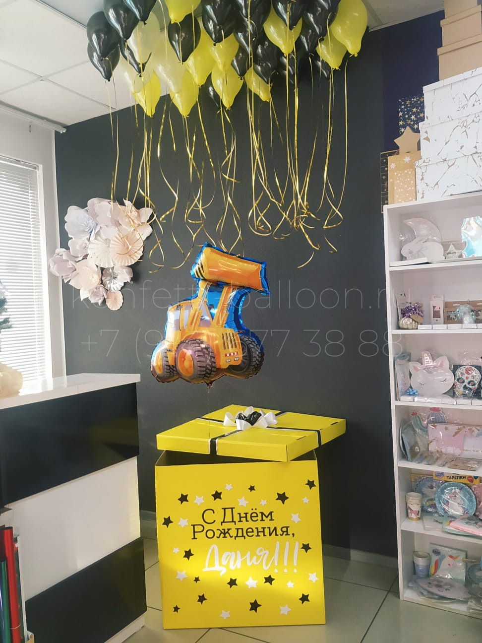 Коробка сюрприз с мини шарами и экскаватором для мальчика, сына. В коробку можно положить подарок.