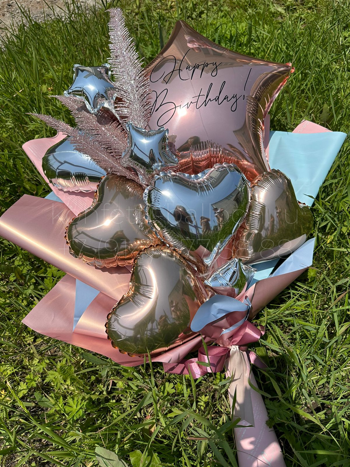 Крафтовый букет из фольгированной звезды 18 дюймов (45 см) с индивидуальной надписью и 5 фольгированных мини-сердец. Отличная альтернатива гелиевым шарам. Возможно повторить в любой тематике.
