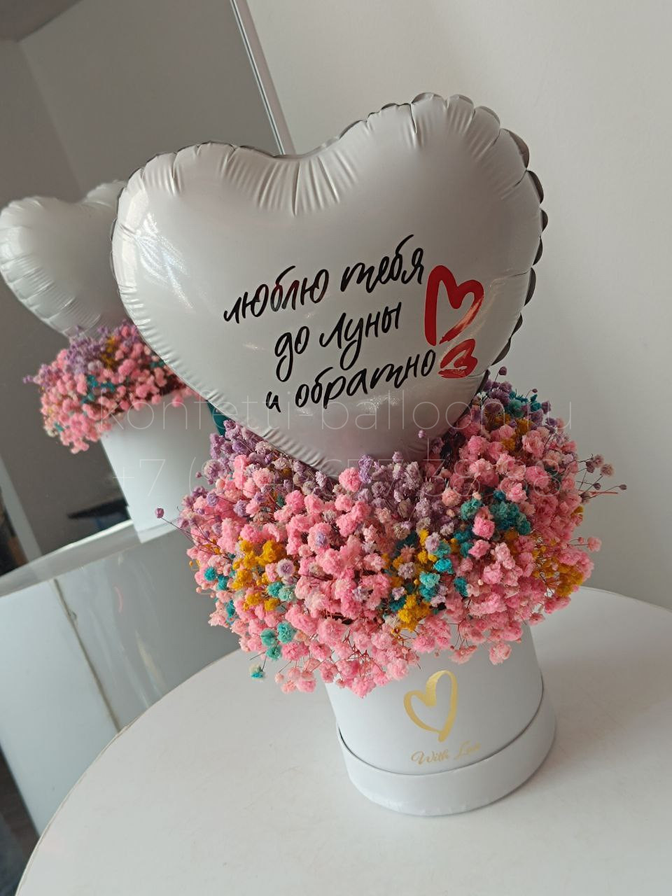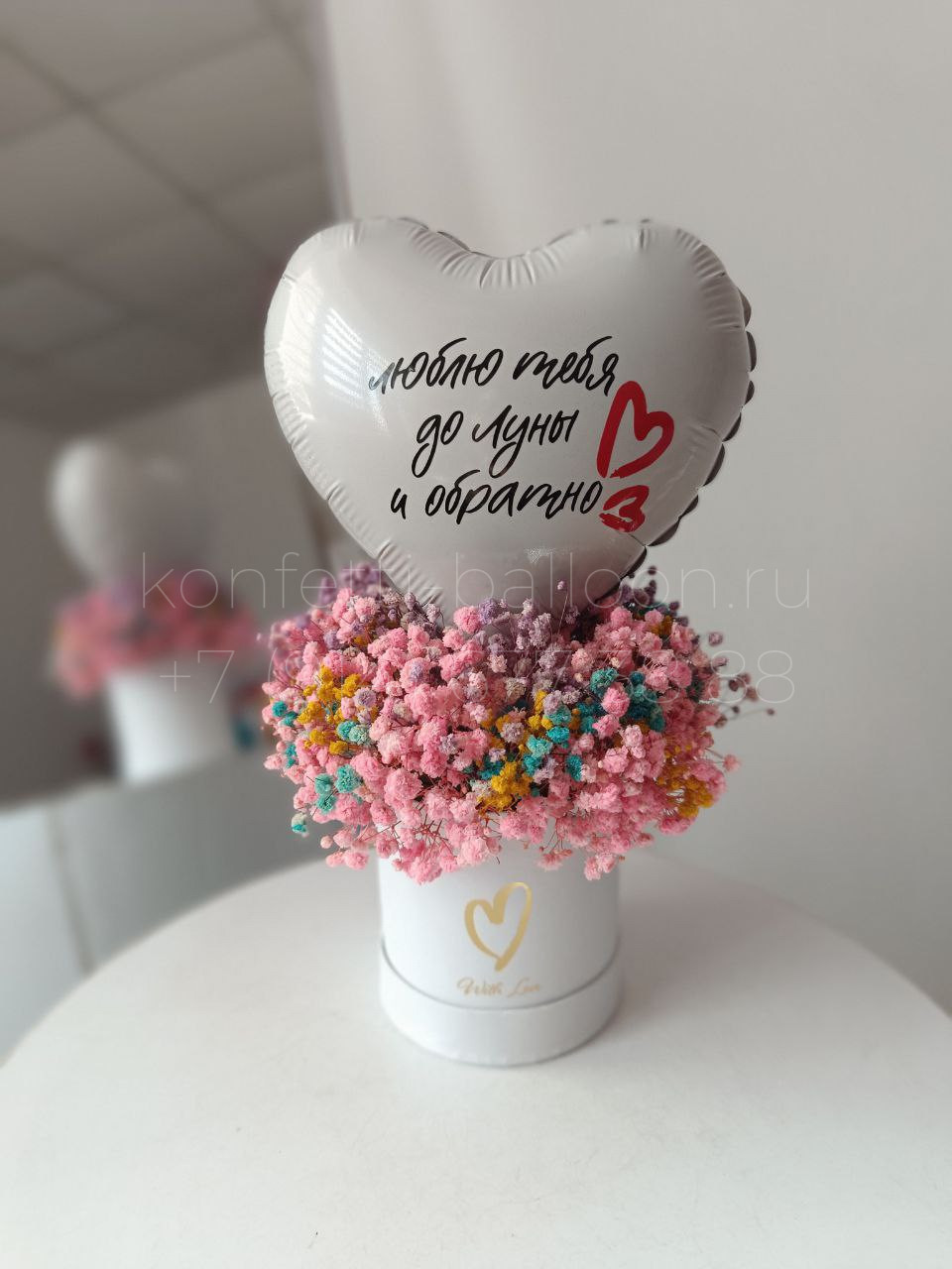 Мини-бокс с гипсофилой и фольгированным сердцем с надписью о любви – прекрасный подарок по особому случаю или просто так.