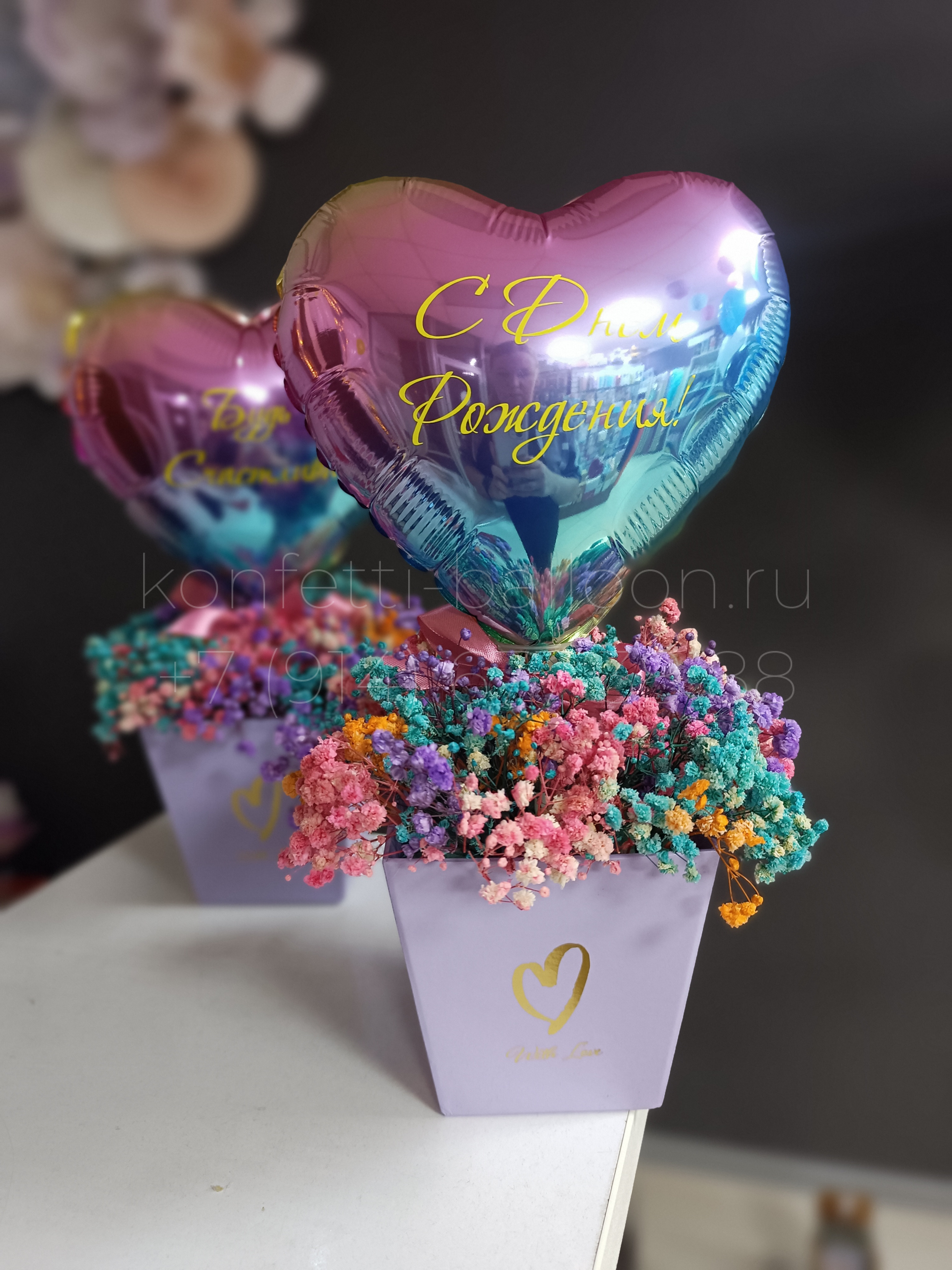 Мини-бокс с гипсофилой и фольгированным мини-сердцем с надписью – отличный подарок или комплимент на день рождения, выпускной, в знак благодарности.