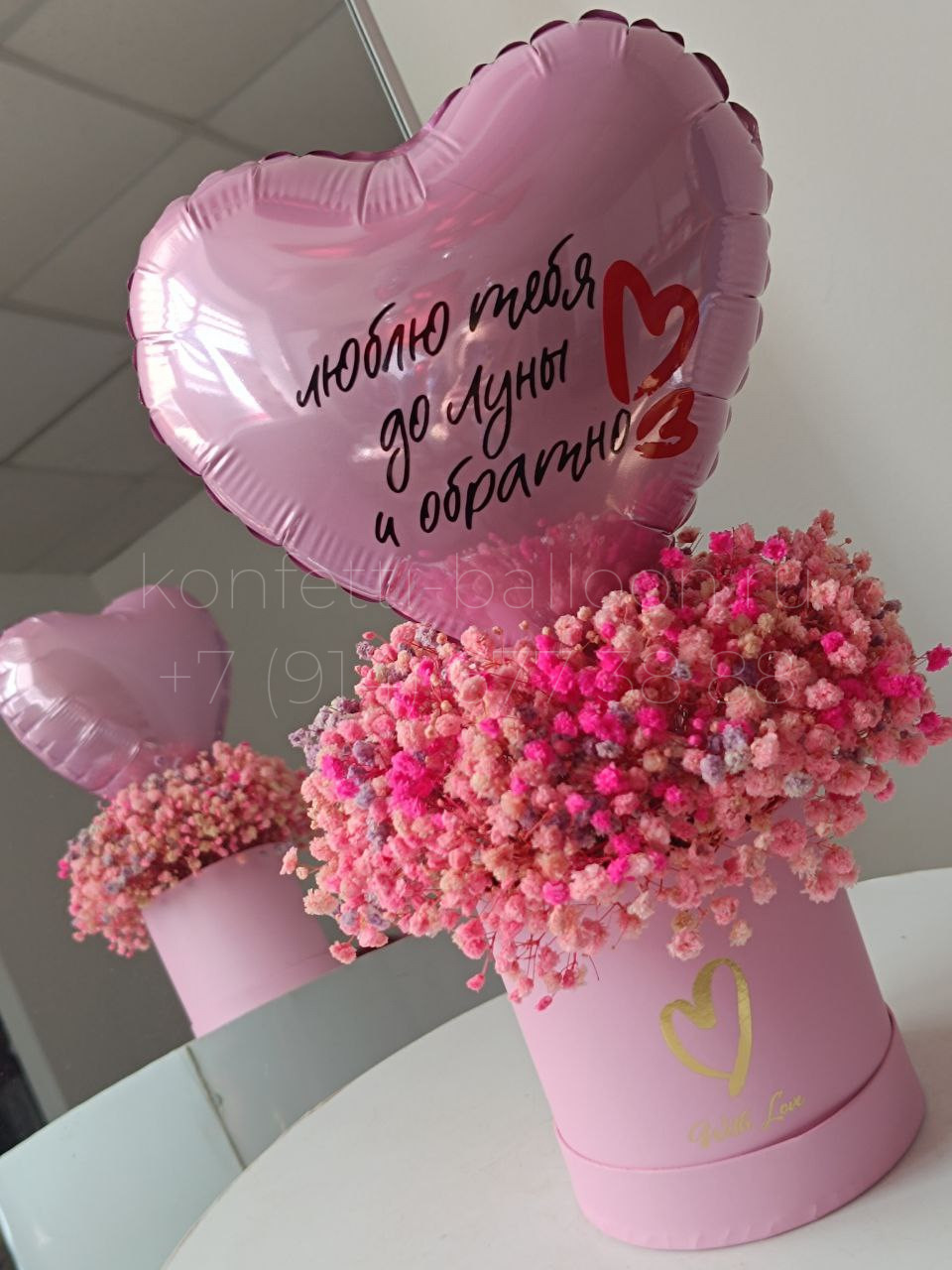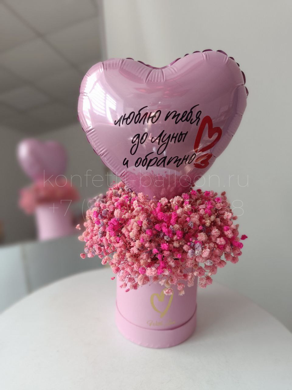 Мини-бокс с гипсофилой и фольгированным сердцем с надписью о любви – прекрасный подарок по особому случаю или просто так.