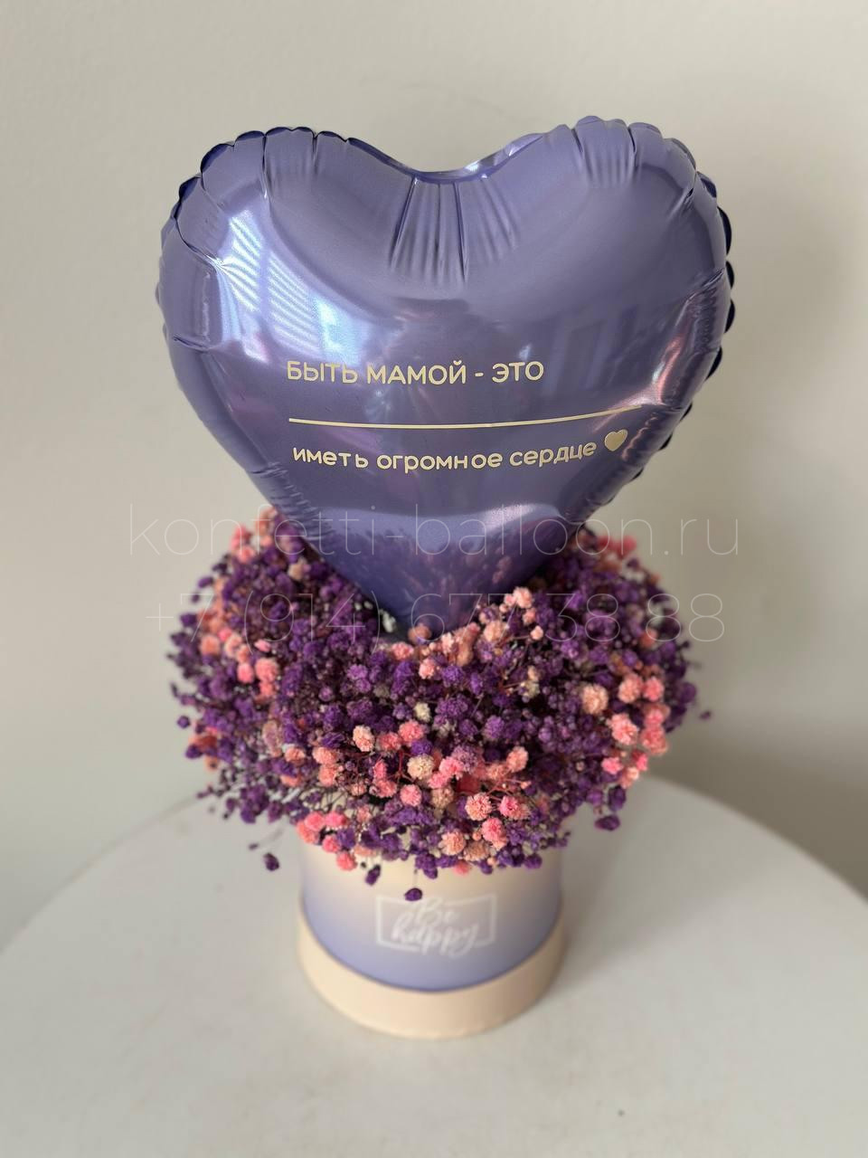 Мини-бокс с гипсофилой и фольгированным сердцем – что может быть еще прекраснее в подарок по особому случаю, на День Мамы, день рождения или просто так.