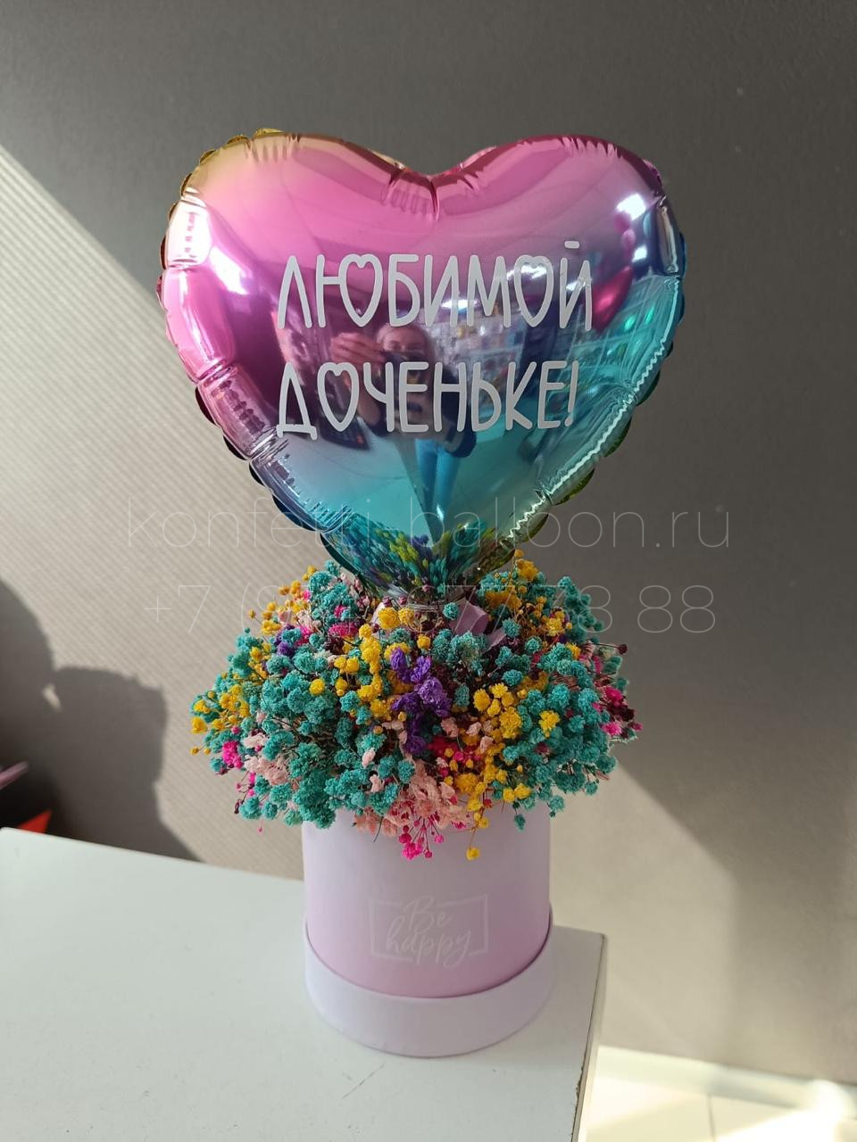 Мини-бокс с гипсофилой и фольгированным сердцем – отличный подарок или комплимент для Ваших близких.
