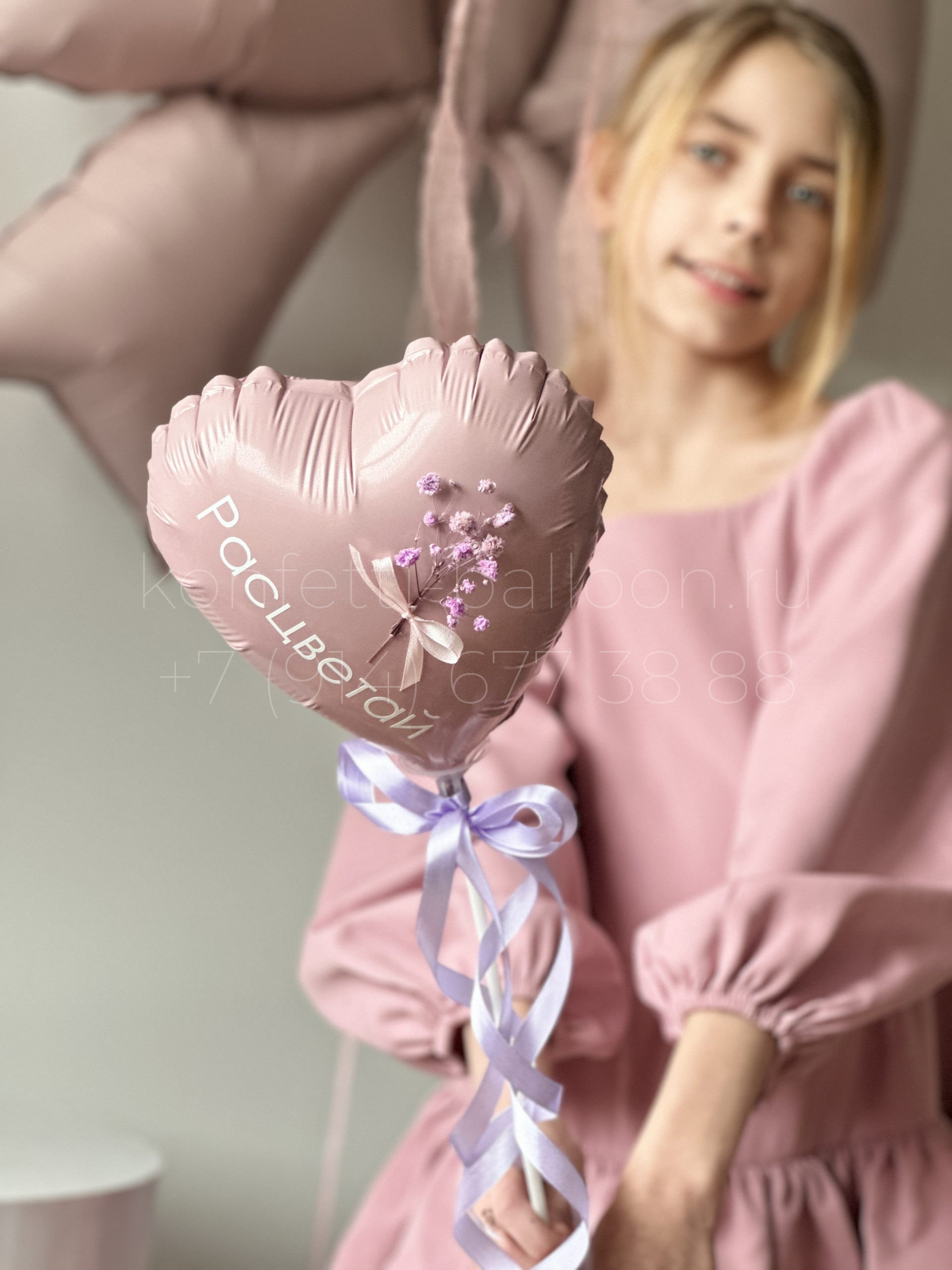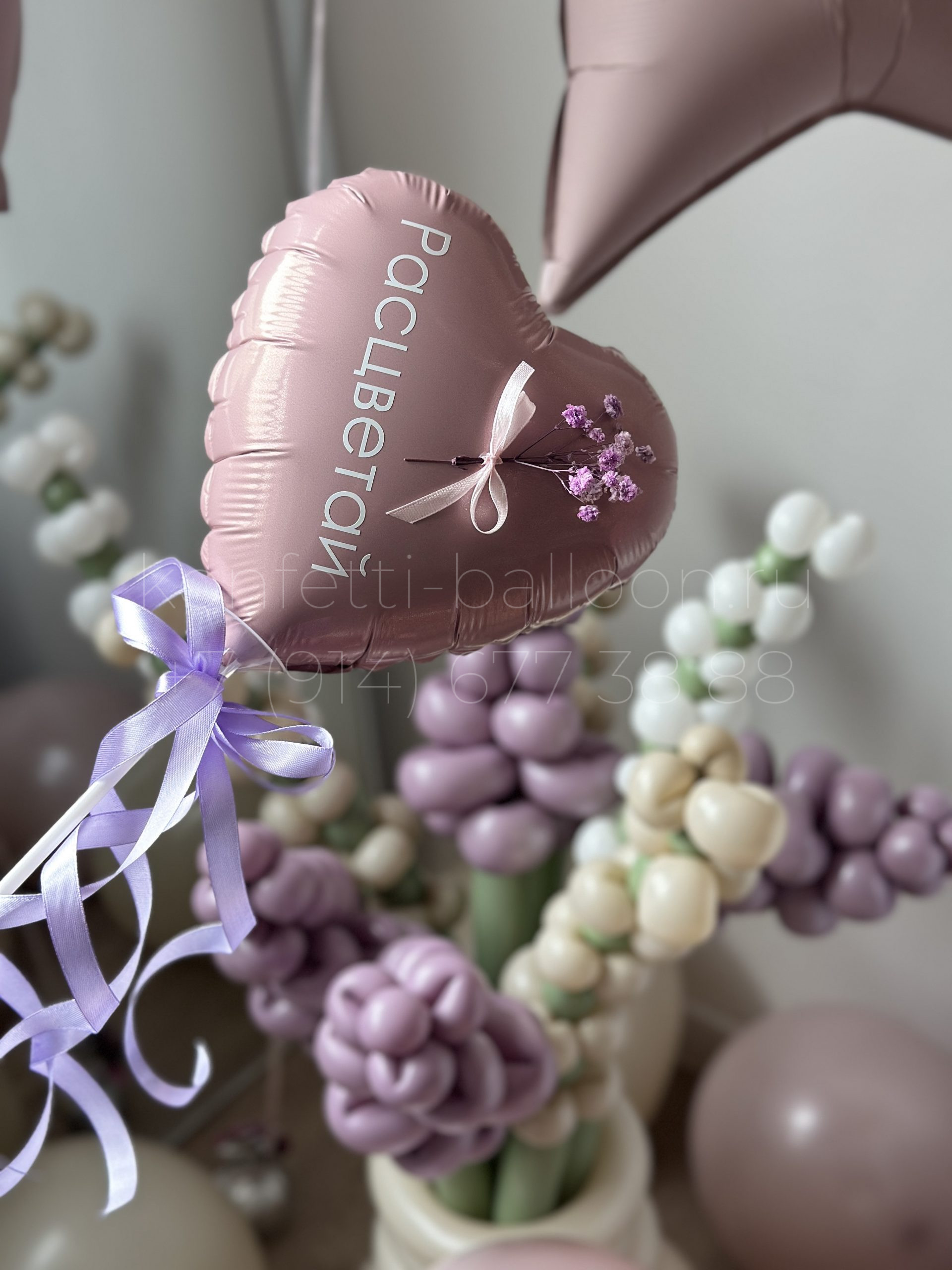 Мини сердечко фольгированное 22,5 см на палочке с весенней надписью и декором веточка гипсофилы