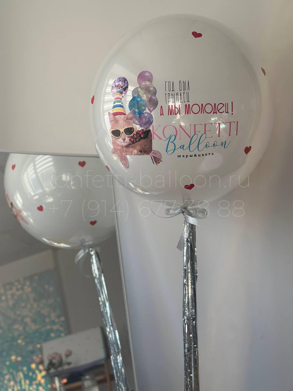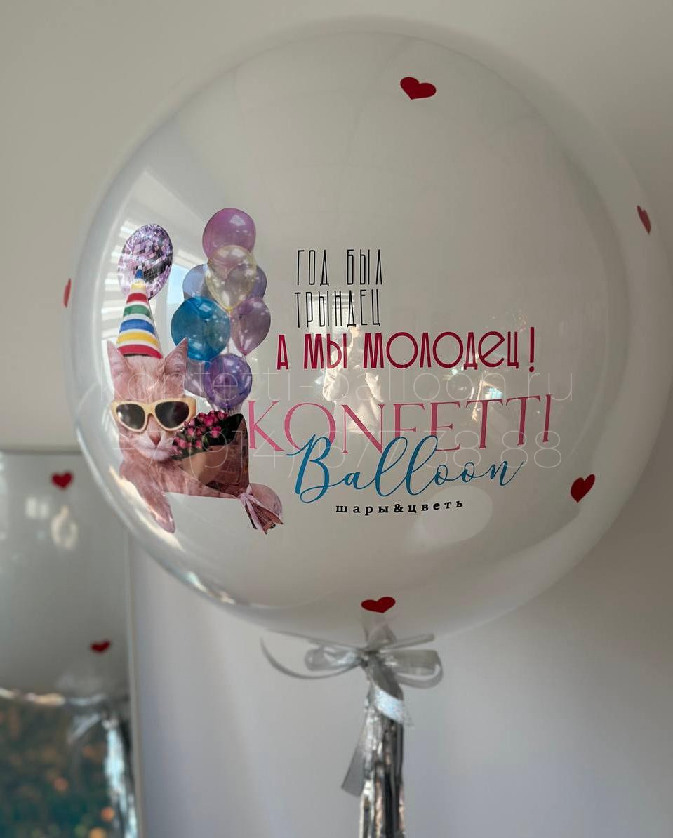 Шар гигант 60-65 см в стеклянной технике с индивидуальной надписью и изображением, с декоративным дождиком