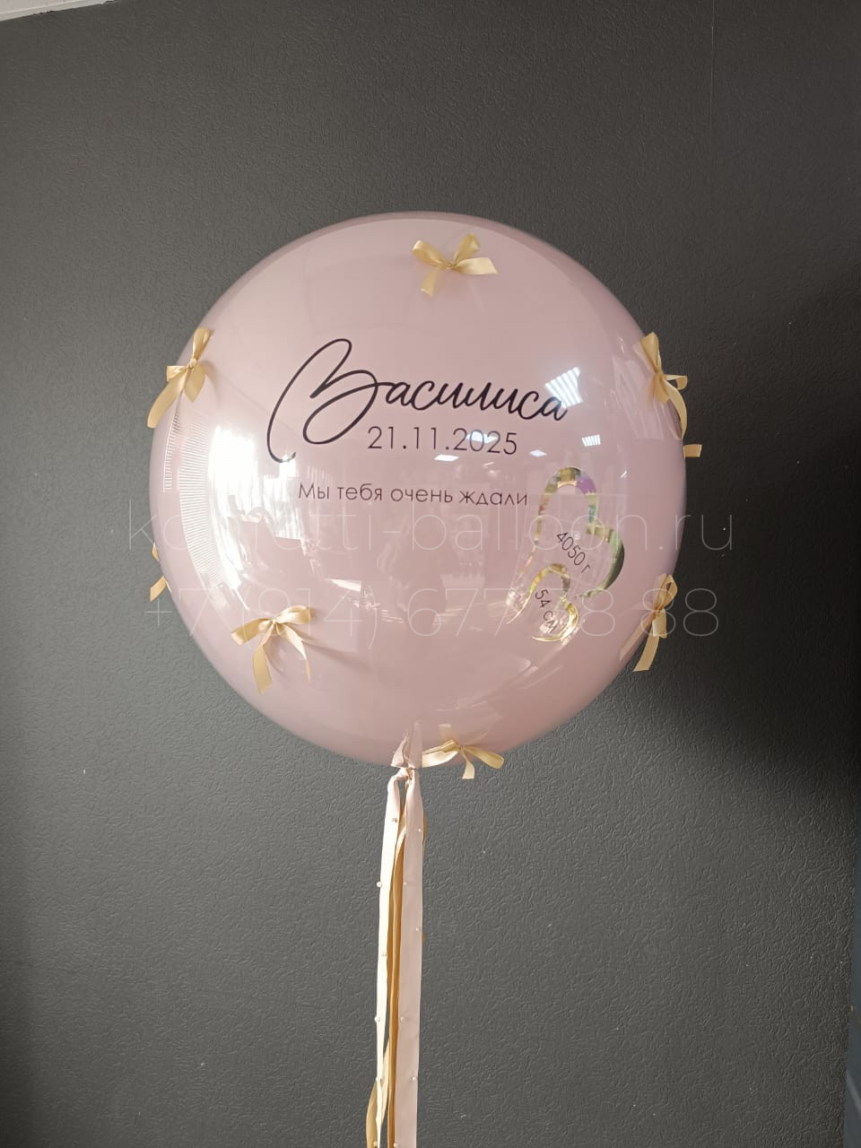 Шар гигант 60-65 см в стеклянной технике с индивидуальной надписью и дополнительным декором бантики из атласной ленты