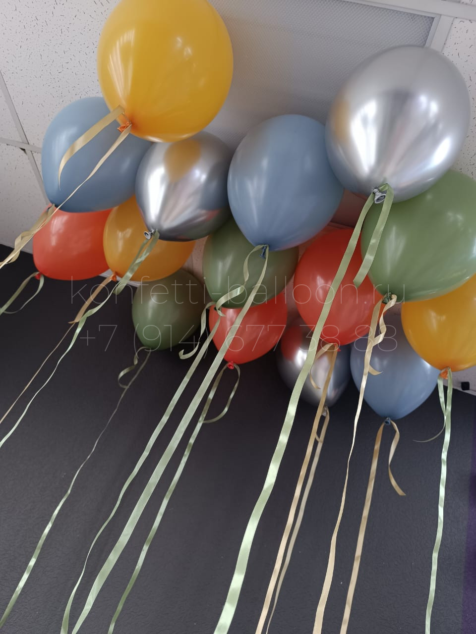Гелиевые шары россыпью под потолок на атласной ленте: