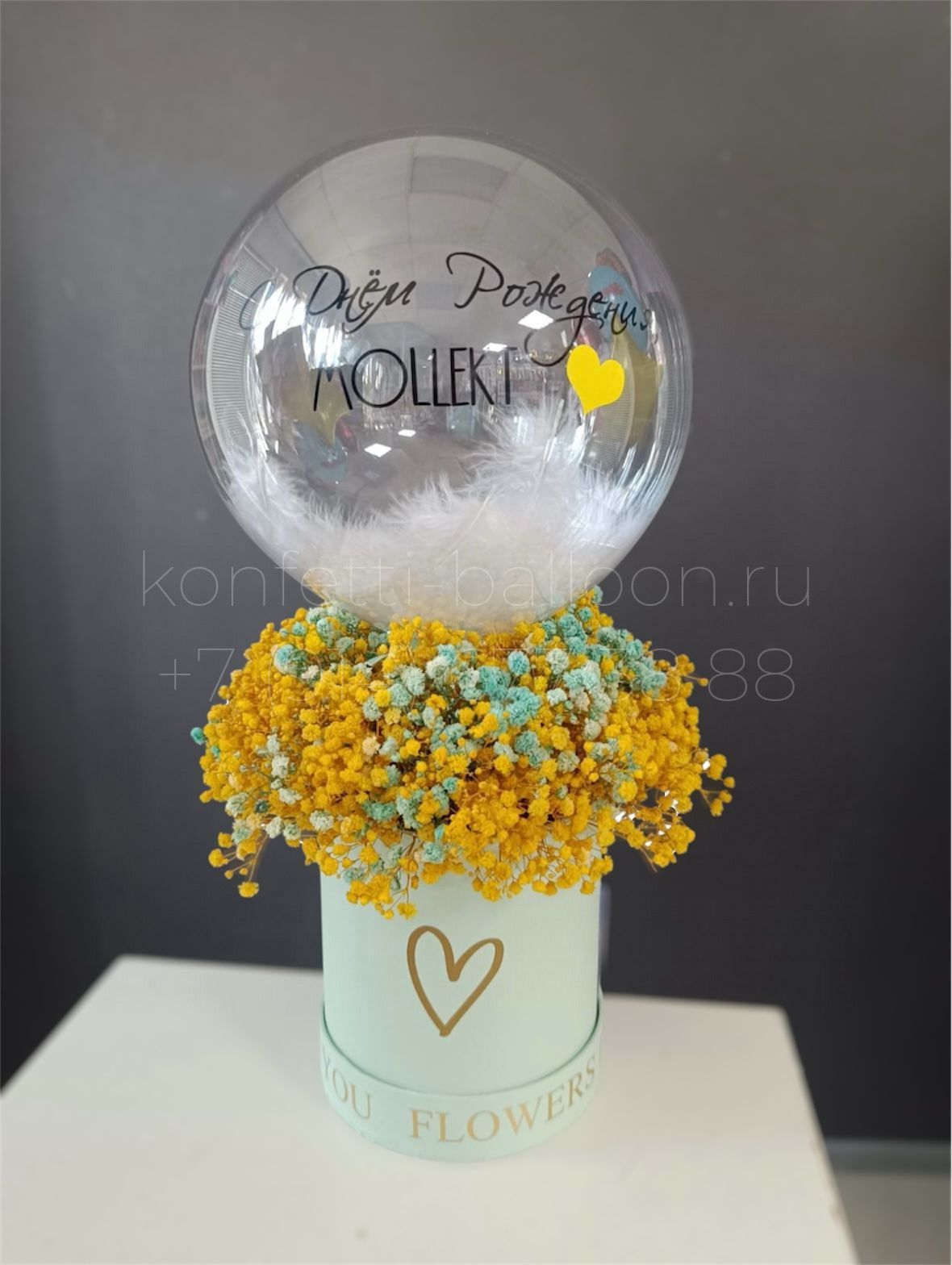 Средний бокс с гипсофилой и мини шаром Bubbles с Вашим логотипом – что может быть еще прекраснее в подарок по особому случаю: открытие, знаменательная дата или просто так для украшения интерьера.
