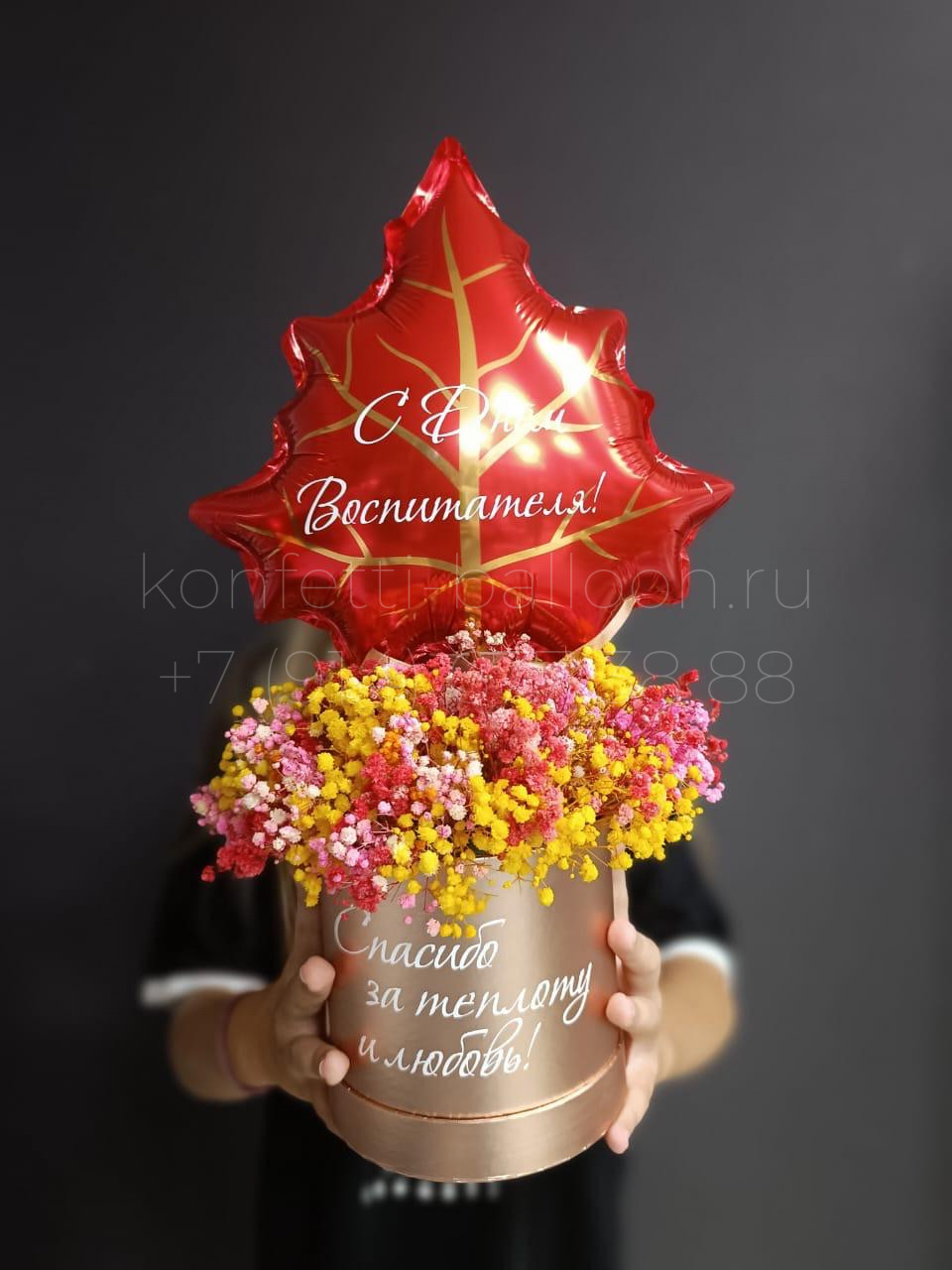 Средний бокс с гипсофилой и кленовым мини листиком для воспитателя, учителя, педагога